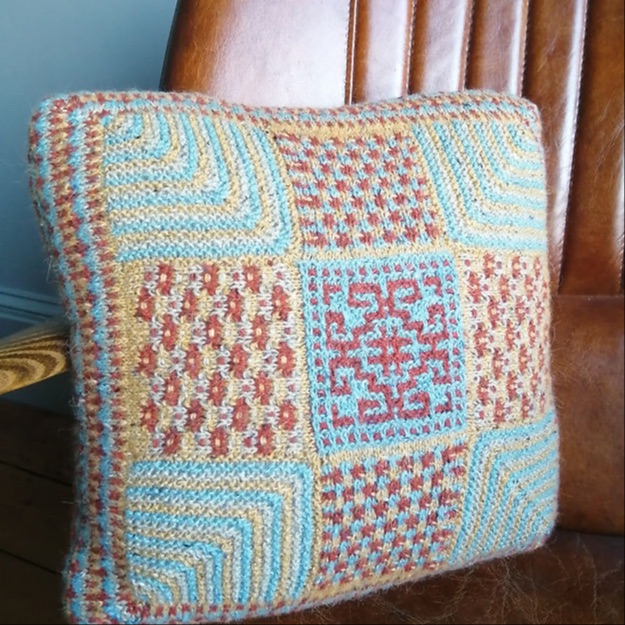 Next we will create the compelling garter stitch mitred squares, created by picking up stitches along the edges of two previously made squares and then decreasing to finish at the corner of the cushion.